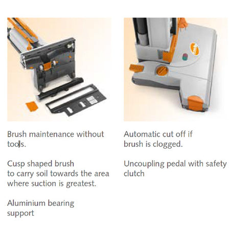 - The particular distribution (“cusp-shaped”) of the bristles on the cleaning brush improves the efficiency of dirt pick-up; furthermore, the brush can be replaced without any need to use tools.